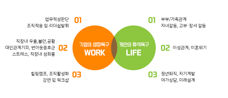 개인의 실질적인 스트레스 관리 및 문제해결뿐 아니라 동료와의 관계나 업무적응 나아가 가족내 갈등, 자녀문제에 이르기까지 조직원이 겪는 심리적인 어려움 등 삶의 다양한 스트레스와 어려움을 나누고 해결을 돕습니다.
